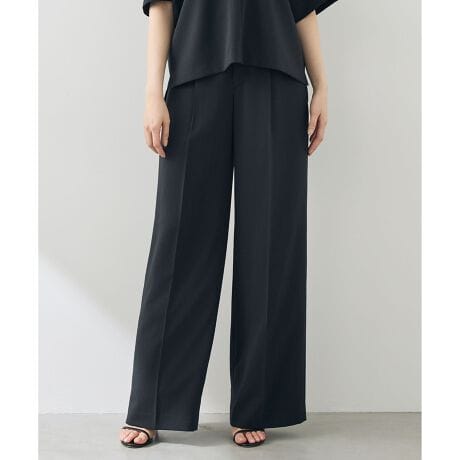 機能性と上品さが揃った通勤にも最適なパンツ ■デザイン1タック入りのワイドストレートパンツです。裾に向かってすとんと落ちるシルエットが、足を長くきれいに見せる視覚効果を生み出します。ウエストは脇から後ろにかけてゴム仕様で、きちんと感を保ちながら快適な履き心地です。同素材のブラウス(BLWRLM0411)やジャケット(JKWRLM0411)と合わせたセットアップスタイルとしてもスッキリとまとまり、おすすめです。■素材梳毛調のストレッチポリエステルをベースに、オリジナルのスラブ糸を使用したツイル素材です。ナチュラルワッシャー加工と減量加工を組み合わせることで、ソフトな風合いと程よい落ち感を引き出しました。きれいな表情を保ちながらも快適な着心地が魅力で、接触冷感・吸水速乾・UVケア・着用時の防シワといった機能性も備えています。■同素材ジャケット(JKWRLM0411)ブラウス(BLWRLM0411)