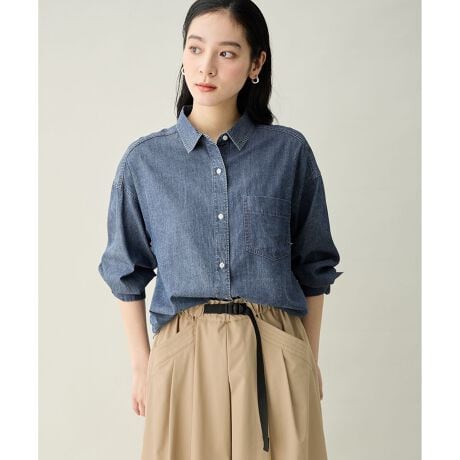 ・とにかく軽い、ストレスフリーな着心地のライトオンスデニムシャツ・着膨れしづらい、計算されたオーバーサイズシルエット・落ち感のある素材で、すっきり華奢見え効果も◎・春夏ムードを高める爽やかなステッチもポイント