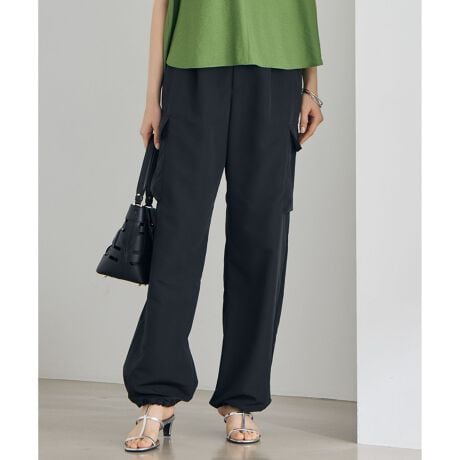 快適さと上品さを両立した大人のためのカーゴパンツ■デザイン1タックを入れたワイドストレートシルエットのカーゴパンツです。サイドのパッチポケットはマチを控えめにし、シームには太番手のステッチを効かせることで、カジュアルな中にも上品さが漂うデザインに仕上げました。裾にはゴムが入っており、お好みのボリューム感にシルエットを調節して着ていただけます。ウエストは脇から後ろにかけてゴム仕様となっており、きちんと感がありながらも快適な履き心地を実現しました。大人のカジュアルスタイルを格上げする、着映えアイテムです。■素材ブラック(005)とカーキ(054)カラーは、タテ糸にリサイクルポリエステルフィラメント、ヨコ糸にポリエステルスパン糸を使用し、合成繊維でありながらも天然素材のようなマットでナチュラルな表情感が特徴の素材です。高密度で織ることで軽やかさとしなやかさ、程よいハリコシを両立しており、見た目は上品なマット感、手触りはさらっとした感覚が特徴です。 ピスタチオ(060)カラーのみ、綿タッチのタスラン糸とストレッチのポリエステル糸を使った機能性ポリエステル素材を使用しています。肉感がありながらも軽さがあるのが特徴です。全カラー、ポリエステル100%のイージーケア素材で弱撥水機能もあるので、お天気を気にすることなく着ていただけます。