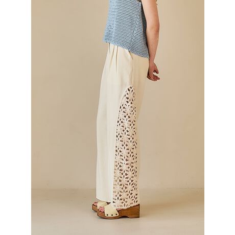ネップの効いた綺麗な生地感と、サイドにフラワー柄の穴あき素材を配置して大人の肌見せ感もある、春夏にぴったりなトラウザー。