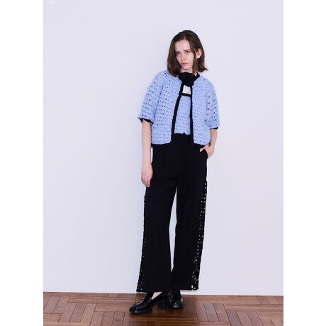 ネップの効いた綺麗な生地感と、サイドにフラワー柄の穴あき素材を配置して大人の肌見せ感もある、春夏にぴったりなトラウザー。