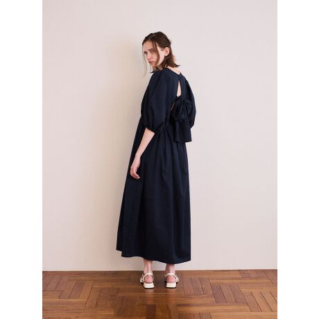 ボリューム感のある袖と、コンパクトな身頃がメリハリのあるシルエットに、後ろの大きなリボンが特徴のワンピース。