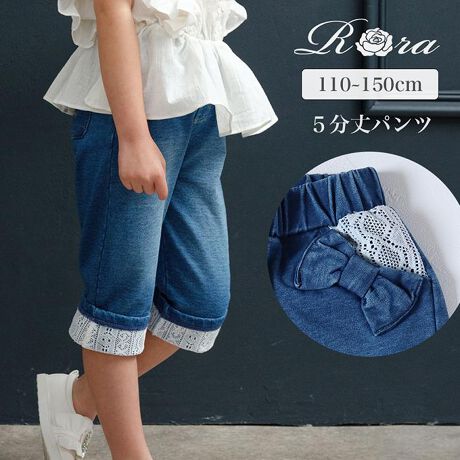 Rora デニムパンツ 通販 ローラ ラピス ジーンズ パンツ ロールアップデニム キッズ 女の子 レース リボン 春夏 春秋 五分丈 七分丈 5分丈 7分丈 動きやすい ストレッチ おでかけ カジュアル ボトムス かわいい おしゃれ 子ども服 子供服