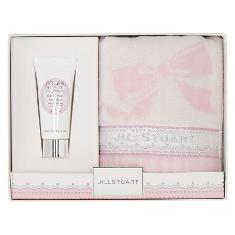 3種類のハンドクリーム(ピンク:ホワイトフローラル/ライラック:ミルクティーブレンド/ローズピンク:ラシャスベリー)と、リボン柄が目を引くタオルハンカチのセットです。プレゼントにおすすめです。