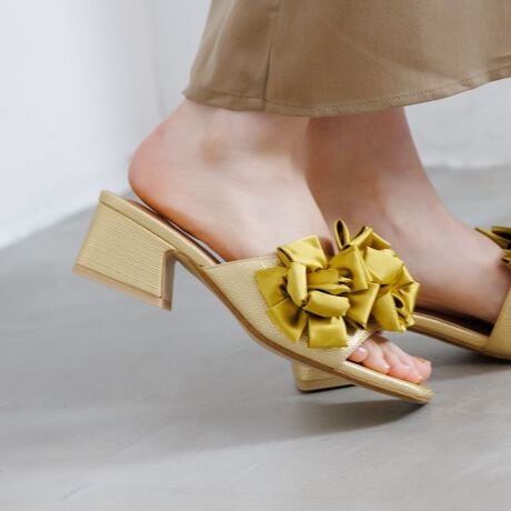 HANAE MORIらしい立体的なフラワーフリルを大胆にあしらったミュール。光沢感のある生地を重ねたボリューミーなフリルが、足元にフェミニンな華やぎをプラスします。スクエアトゥの程よいモード感が甘さを引き締め、洗練された印象に。ブラックはフリルの立体感を際立たせつつシックな雰囲気に、アイボリーは女性らしさを引き立て、軽やかな足元を演出。イエローはアクセントカラーとして存在感を添えるカラーです。デニムやリゾートワンピースなど、夏の装いを引き立てる主役級の一足。