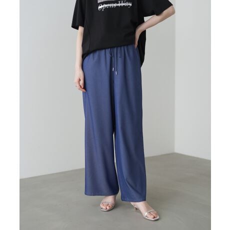 セミワイドのシルエットが脚のラインを拾いにくく、はくだけで女性らしいバランスに。