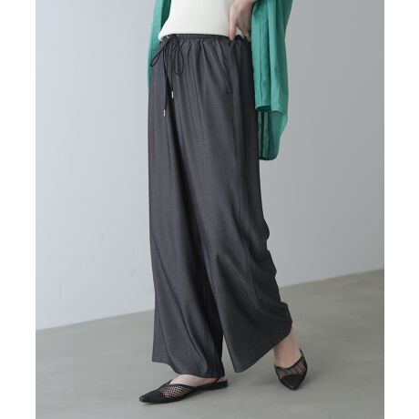 セミワイドのシルエットが脚のラインを拾いにくく、はくだけで女性らしいバランスに。