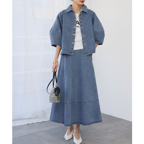 スカートは動くたびに軽やかに広がるフレアシルエットで、カジュアルなデニム素材ながらエレガントな仕上り。