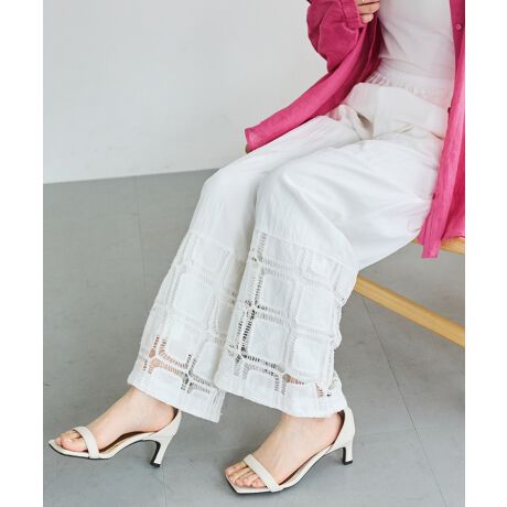 裾にレース切り替えを施した、パッチワーク風デザインが魅力のワイドパンツ。