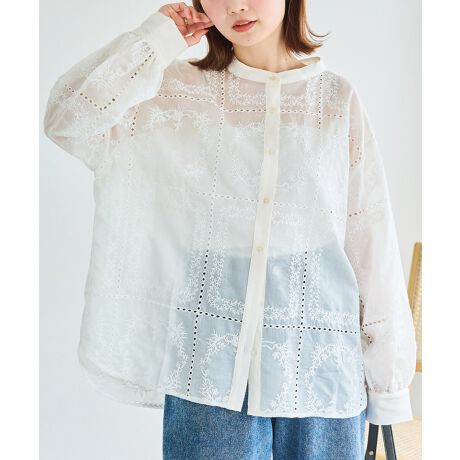繊細なレース風刺繍をあしらったシアーブラウス。
