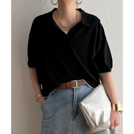 ポロ襟とスキッパーデザインを組み合わせたニットトップス。