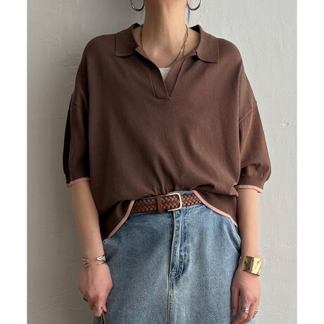 ポロ襟とスキッパーデザインを組み合わせたニットトップス。