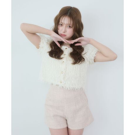 毛足の長いフリンジ素材が華やかな存在感を放つ、主役級トップス。