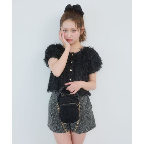 毛足の長いフリンジ素材が華やかな存在感を放つ、主役級トップス。
