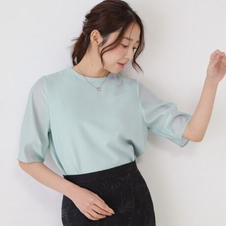 【手洗い可/日本製/袖シアー感】異素材ドッキングブラウス