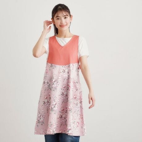 人気の無地切り替えの背付きエプロンは、首元がすっきりとした深めのVネックに、Aラインのシルエットが女性らしいデザインです。