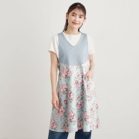 人気の無地切り替えの背付きエプロンは、首元がすっきりとした深めのVネックに、Aラインのシルエットが女性らしいデザインです。