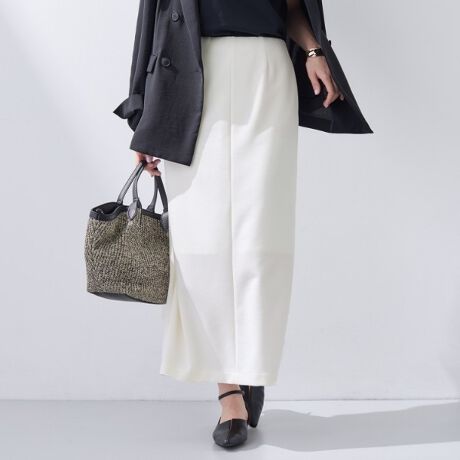 着心地がイージーでシンプルなIラインスカートは合わせを問わずご着用いただけます。