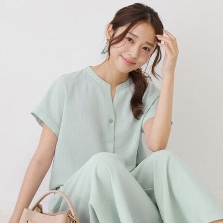 衿はキーネックのスッキリとしたデザインで、オンでもオフでもシーンを選ばず着ていただけます。