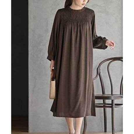 レーヨン麻スモッキング7分袖ワンピース