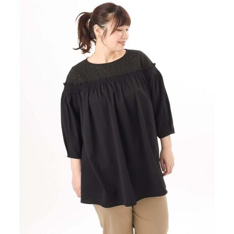 顔周りを明るく見せるアイレット刺繍使いで、一枚で着映えるスタイリングに。