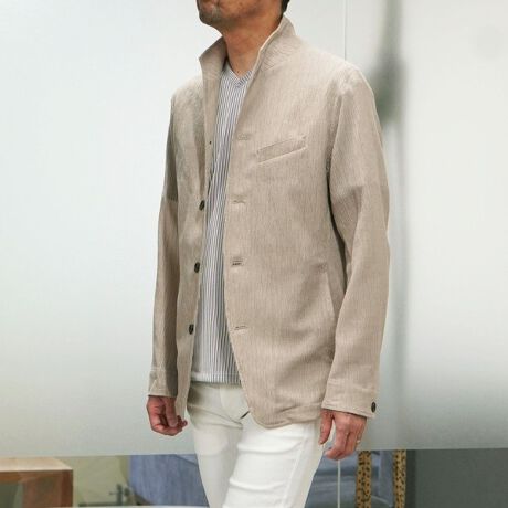 衿端にワイヤ−を仕込んだシャツ感覚で着られるスタンドカラーカヴァーオールジャケットとなります。