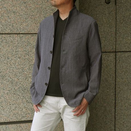 衿端にワイヤ−を仕込んだシャツ感覚で着られるスタンドカラーカヴァーオールジャケットとなります。