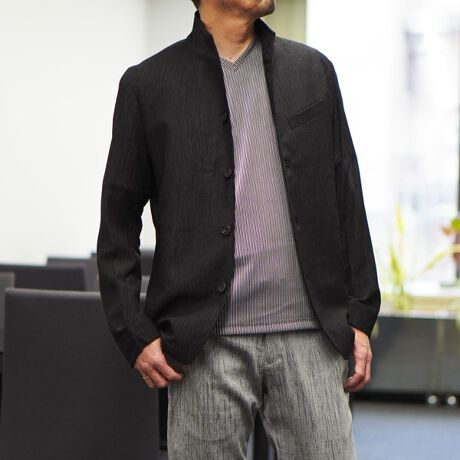 薄いポリエステル素材に楊柳の様な細かいプリーツ加工を施した素材です。生地自体のシャリっとサラッとしたドライな風合いは肌離れが良くシワになりづらいイージーケア性が特徴で春先〜晩夏まで、長い期間着られる素材となっています。