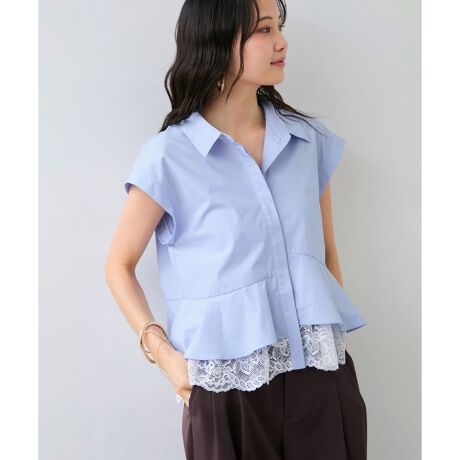 程よく肌離れするボクシーなシルエットでアウトスタイルが決まる1枚。フレンチスリーブでさりげなく肩回りをカバーしてくれます。釦を閉じてトップスとしてはもちろん、開けて羽織としても着回しがきくシャツです。トレンドのレースを甘くなりすぎないよう裾から見えるよう設定しました。ペプラム切替を波打った形状にしているのでイレギュラーなフレアで柔らかい印象に。第一釦は表面をプレスしたようなメタル釦できらっとしているのがポイント!