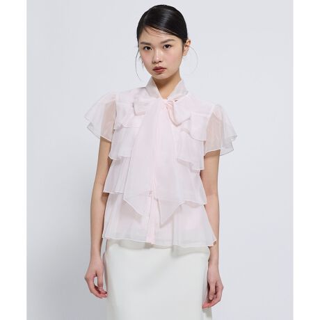 フロントに施したボウタイと、重なり合うフリルデザインが印象的なブラウス。