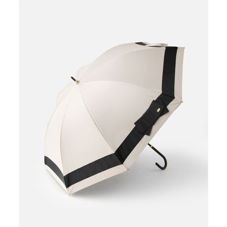 太めのグログランリボンアクセントと細めの持ち手がエレガントな表情の晴雨兼用長傘。防水機能とともに紫外線100%カットや遮熱性なども兼ね備えた生地を使用。ベージュベースに黒のライン配色がモダンで、甘くなりすぎず大人な表情を映し出します。
