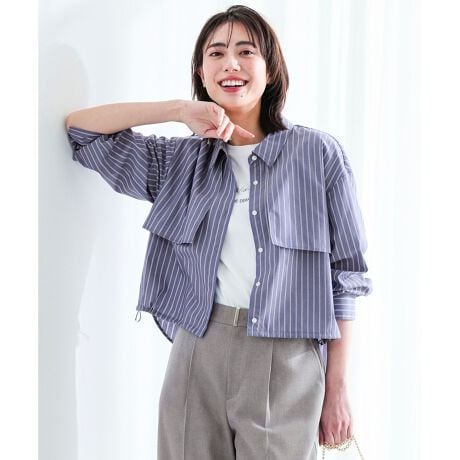 ・さらっと羽織るだけでおしゃれに決まるシャツアイテム・シャツ襟デザインでトレンド感をプラス・前裾のみゴムドロスト仕様で、絞るとギャザー感が可愛いバルーンのようなデザインに・絞ったゴム紐は脇タブで留めて裾から見えないように調整可能・前後差のある着丈でバランスがとりやすく、体形カバーも◎・身頃に重なったヨークデザインが上半身に程よいボリュームをプラスし、着映えする一枚・カジュアル通勤から休日のカジュアルコーデまで幅広く着回し可能