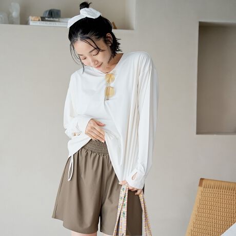 ショートパンツは、ウエストがぐるりゴムのシャーリングデザイン仕様。楽な穿き心地と女性らしさをプラスしています。