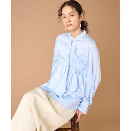 ■デザイン胸元からウエスト部分にかけて、シャーリングが施されたブラウス。これにより、立体感とドレープが生まれます。アシンメトリーなフリルは左側はドレープを描くように垂れ下がり、右側のシャーリング部分と組み合わさり、左右非対称のデザインを作り出しています。袖はボリューム感のあるパフスリーブ、袖口はカフスとボタンで留めるクラシックなデザイン。カフスの内側にはゴムバンド付きなので、袖口をロールアップしたときにずり落ちにくいのも嬉しいポイント。襟をバンドカラーにすることで甘くなりすぎないようにしています。ゆったりとしたオーバーサイズシルエットで、リラックス感のある着心地が特徴です。■素材細番手のコットンを使用した薄手のサテンです。柔らかいふくらみとドレープ性があり、綺麗な表面感とツヤが特徴的な素材です。・裏地なし・水洗い可■下げ札サイズ表記2=(M/9号)■サンプル撮影商品画像の商品はサンプルです。実際の商品とはサイズや色味、素材、デザイン等の仕様が若干変更になる場合がございます。■カラーについては、可能な限り実際の商品に近いカラーで撮影をおこなっておりますが、照明の関係により実際の製品とは色味が違って見える場合があります。またパソコン・スマートフォンなどの環境により、若干製品と画像のカラーが異なる場合もございます。現物と画像のカラー差異については返品理由となりませんので、予めご了承ください。■サイズ表記はあくまで目安となります。