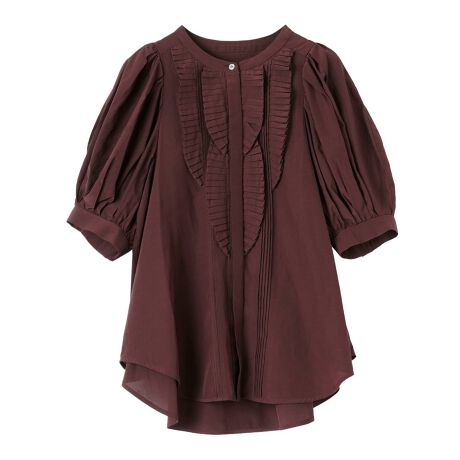 花びらが重なっているかのようなプリーツフリルに、ピンタック、ギャザーといった華やかなディティールが満載。袖山にボリュームがあるので、コンパクトな肩幅でも肩先にゆとりが感じられるパターンとなっています。仕上げにワンウォッシュ加工が施されており、可愛らしさのなかにも抜け感やこなれ感をプラスしたアイテムです。