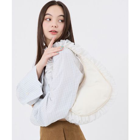 丸みのあるフォルムが可愛らしいハーフムーン型ショルダーバッグ。しっかりとしたマチがあり、長財布や500mlのペットボトルも収納できる頼もしいサイズ感です。身体にやさしく沿うきれいなカーブラインで、肩掛けしやすく持ち心地も◎。
