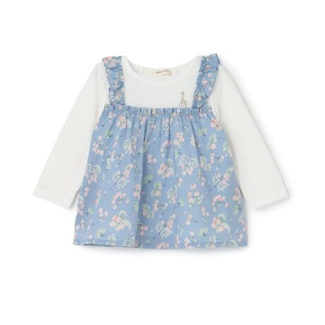 やさしい色味でまとめた実と葉っぱ柄のチュニックです。重ね着しているようなレイヤード風のデザインで、コーデに悩む心配がありません。ショルダーのフリルや、胸元のソフィー刺しゅうが可愛らしいポイント。後ろ衿ぐりはゴム仕様でお着替えしやすいのも魅力です。内側にお名前を記入できるタグつき。