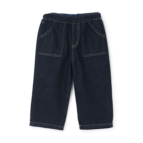 配色のステッチがアクセントになっているデニムロングパンツです。生地にやわらか加工をほどこし、やさしい肌当たりに仕上げました。ウエストは調節機能つきの総ゴム仕様で、動きやすくはき心地も快適。どんなアイテムにも合わせられるデザインのため、デイリーに着回しが利きます。内側にお名前を記入できるタグつき。【おすすめの着用時期は春夏シーズン】