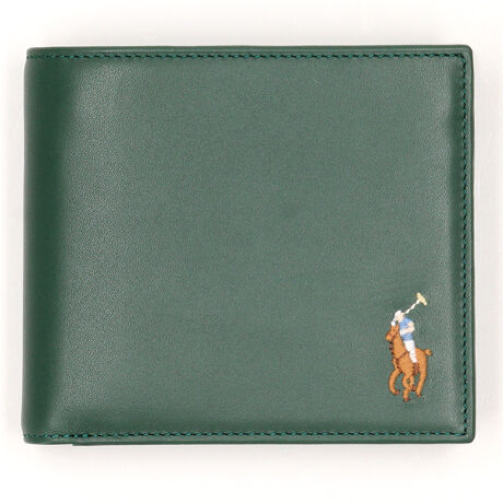 POLO RALPH LAUREN Multi Color Ponyシリーズの二つ折り財布。質感の良いカーフレザーを天然ワックスを使用しアニリン仕上げをすることでソフト感のある素材に仕上げました。シグネチャーのポニーをマルチカラー刺?であしらいアクセントを添え世界観を広げました。グリーンはWEB限定カラーになります。 (機能・収納)札入れ×2 カード段5 小銭入 スリット×3