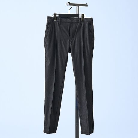 スリムテーパードスラックスをパターンベースに、細いパイピングラインやセンタークリースを施し、上品さのあるカジュアルスラックスに仕上げています。