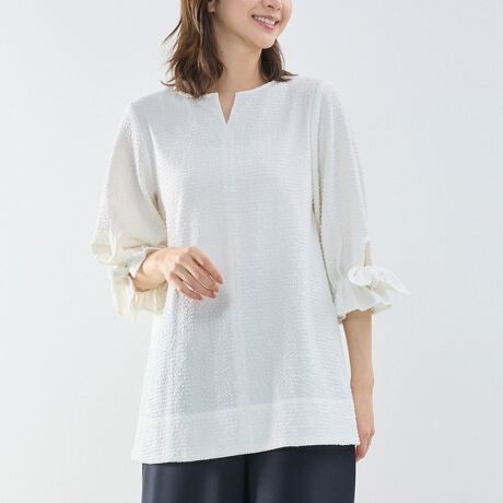 伸縮性のあるワッフル生地を使用した七分袖プルオーバー。程よく厚みのある素材で、安心感のある着心地に仕上げています。ヒップまで隠れる長めの着丈で体のラインを拾いにくく、リラックス感のあるシルエットが魅力。首元のV字切り込みがさりげない抜け感をプラスします。一枚でさらりと着用でき、デイリーからきれいめまで幅広いスタイリングに取り入れやすいアイテムです。