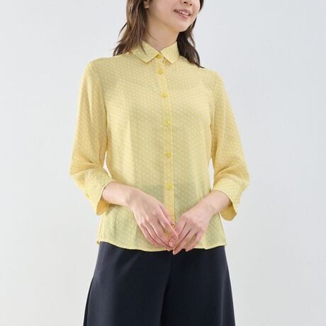 小さな幾何柄プリントをあしらった七分袖シャツ。遠目には無地のように見えるためコーディネートに取り入れやすく、幅広いスタイリングに対応します。ポリエステルのジョーゼット素材を使用し、やわらかな肌当たりで快適な着心地に。程よいシルエットの七分袖デザインで、きれいめにもカジュアルにも活躍する一着です。夏らしいブルーとイエローのカラー展開も魅力です。