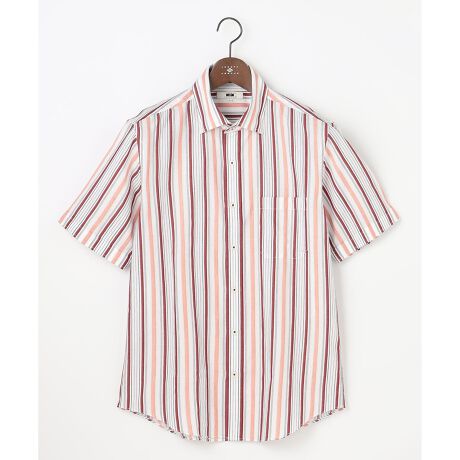 ドビー織りで表現されたストライプ柄の半袖シャツです。襟型はセミワイドフライポイントカラーを採用し、首元をすっきりと見せます。トーンを合わせた配色は落ち着きがあり、大人のカジュアルスタイルに最適です。