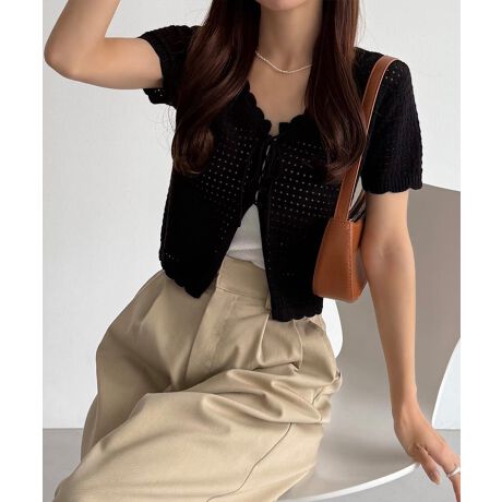 callautia 裾スリットリボン半袖透かし編みニット