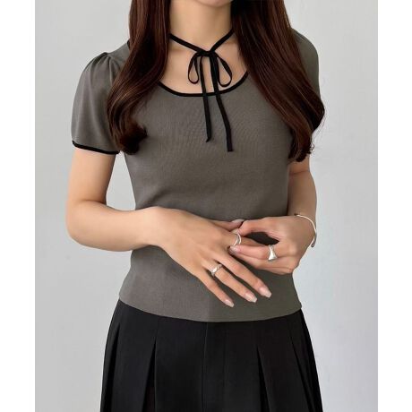 callautia バイカラーリボンパフニットトップス