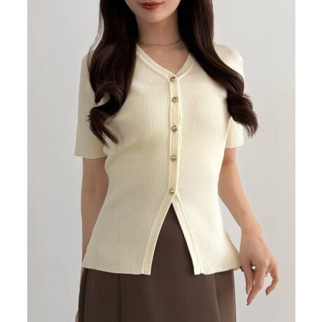 CENEA ゴールドボタン半袖リブニットカーディガン