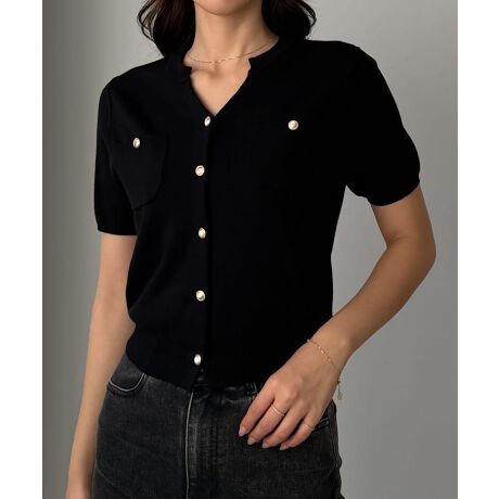Louere キーネックゴールドボタン半袖ニットカーディガン