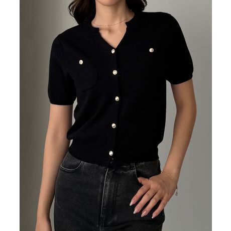 Louere キーネックゴールドボタン半袖ニットカーディガン