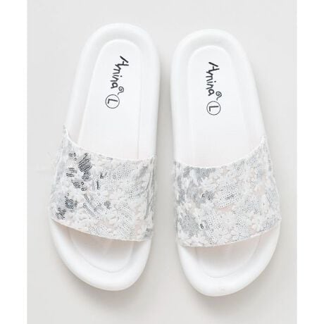[型番:CSYP6104-2026]スパンコールが光を受けてきらめくスライドサンダル。丸みのあるソールで歩きやすく、軽やかな履き心地。足元に輝きを添えたいコーデにおすすめ。