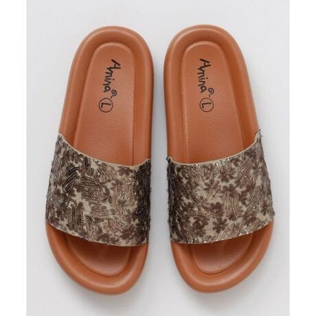 スパンコールが光を受けてきらめくスライドサンダル。丸みのあるソールで歩きやすく、軽やかな履き心地。足元に輝きを添えたいコーデにおすすめ。